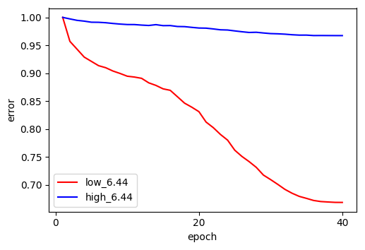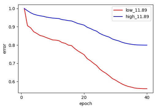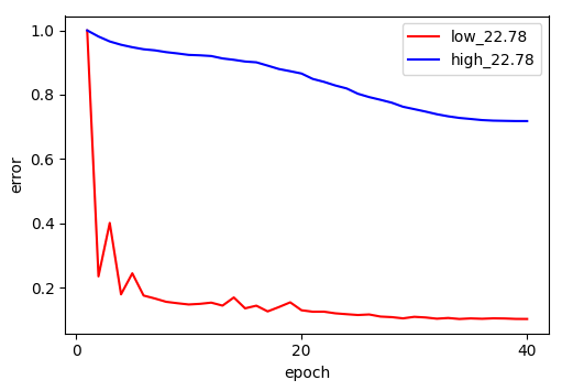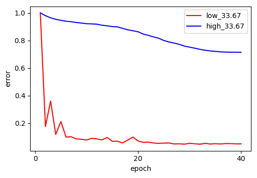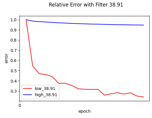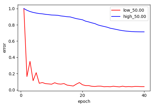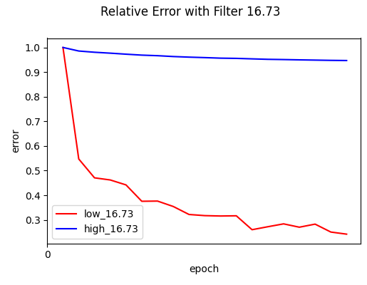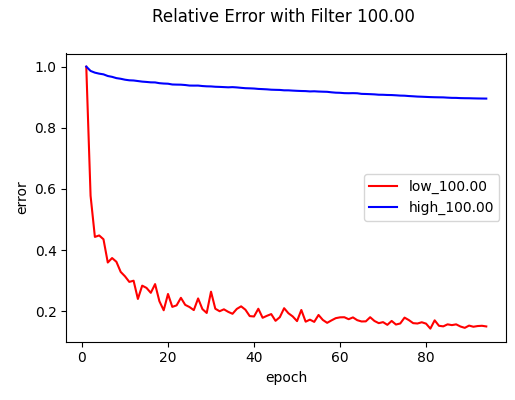 The results strongly support Frequency Principle. As shown in the figures, the low-frequency error (red) drops rapidly in the early epochs, while the high-frequency error (blue) remains stubbornly high and flat, across different $\delta$.